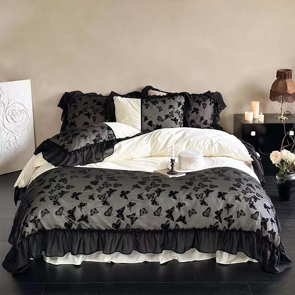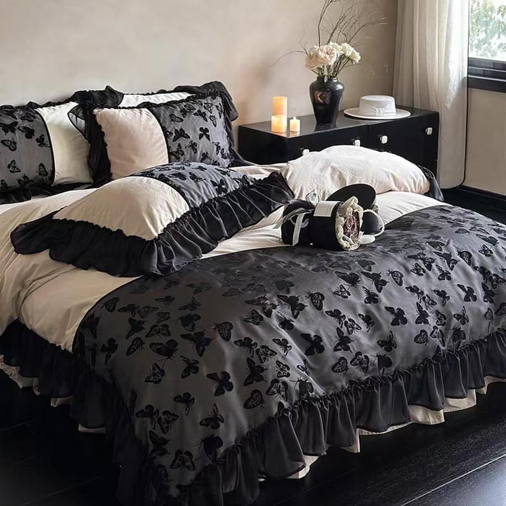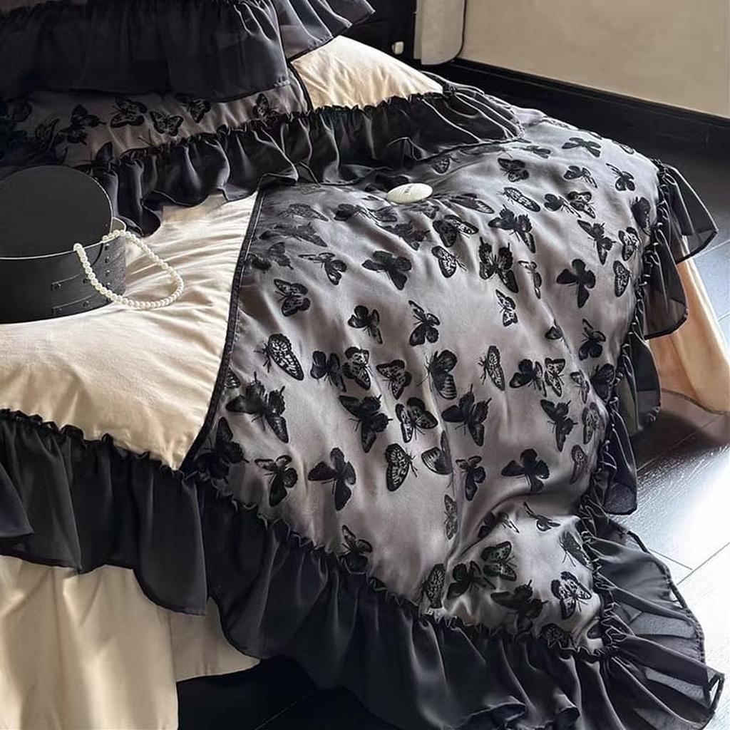If you love Y2K aesthetics and dark academia style. don't miss our butterfly embroidery bedding set! Crafted from soft cotton. it ensures a cozy and comfortable night's sleep. This bedding set features butterfly lace at the bottom. not covering the entire cover. The bed skirt featured in the picture is for added style and is not included. Want to swap the flat sheet for a bed skirt? Contact us!