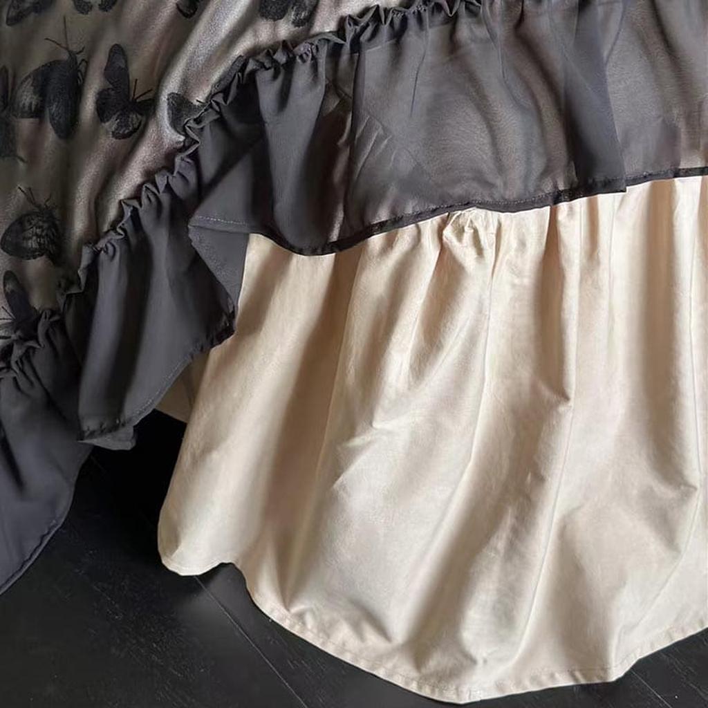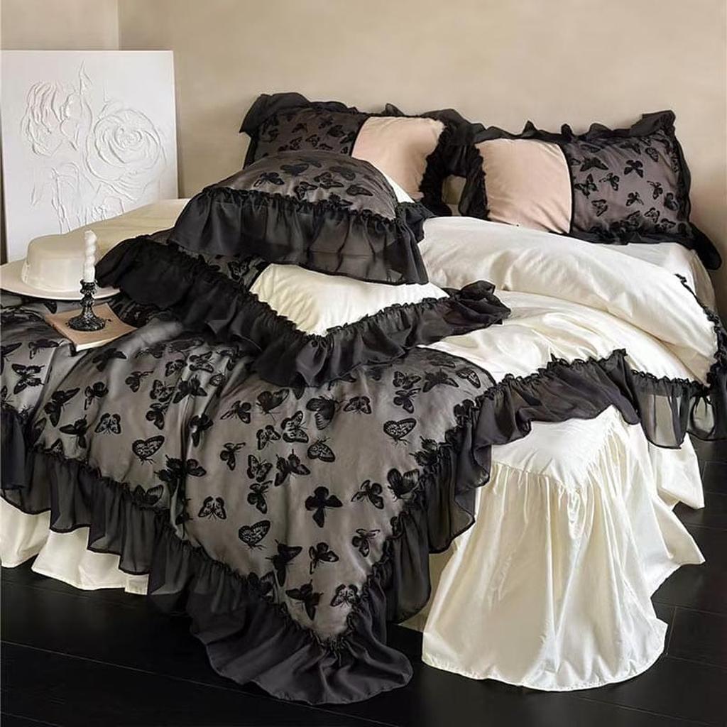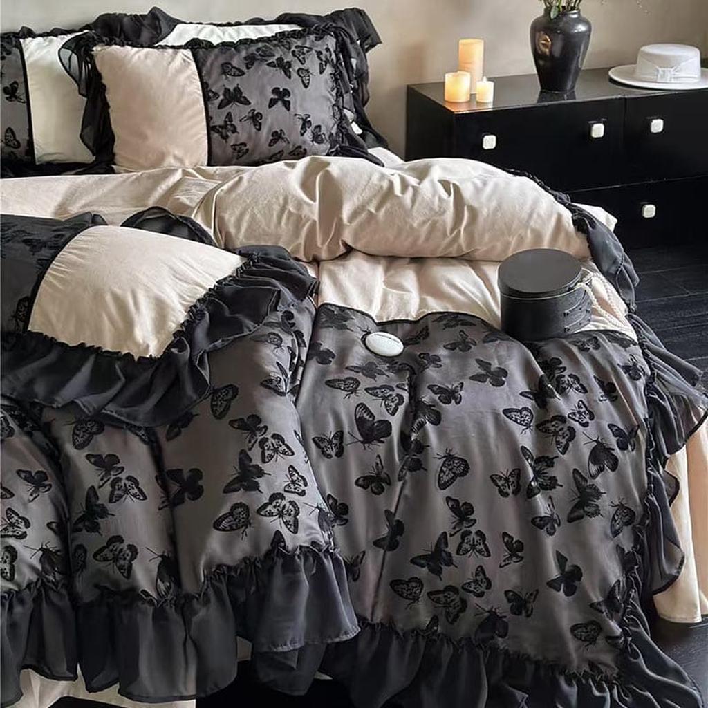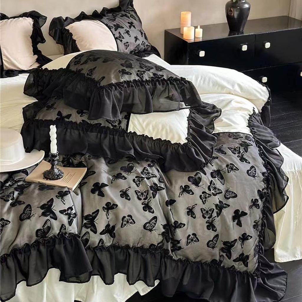 If you love Y2K aesthetics and dark academia style. don't miss our butterfly embroidery bedding set! Crafted from soft cotton. it ensures a cozy and comfortable night's sleep. This bedding set features butterfly lace at the bottom. not covering the entire cover. The bed skirt featured in the picture is for added style and is not included. Want to swap the flat sheet for a bed skirt? Contact us!