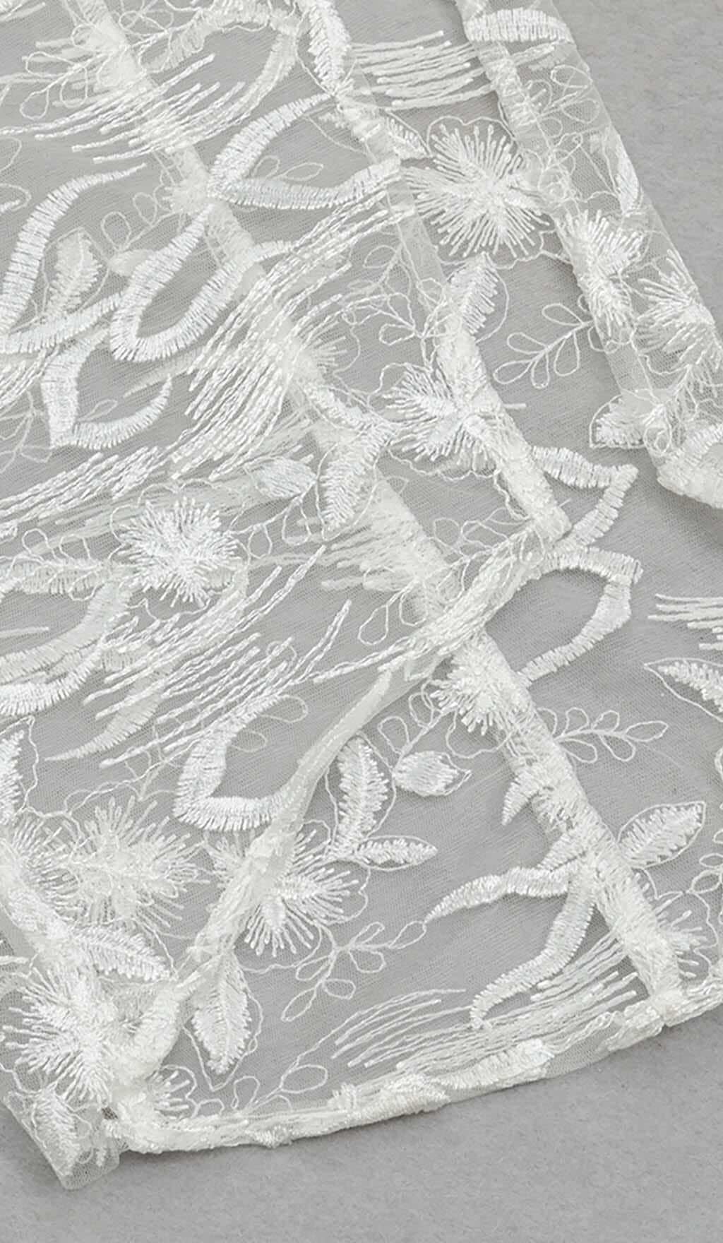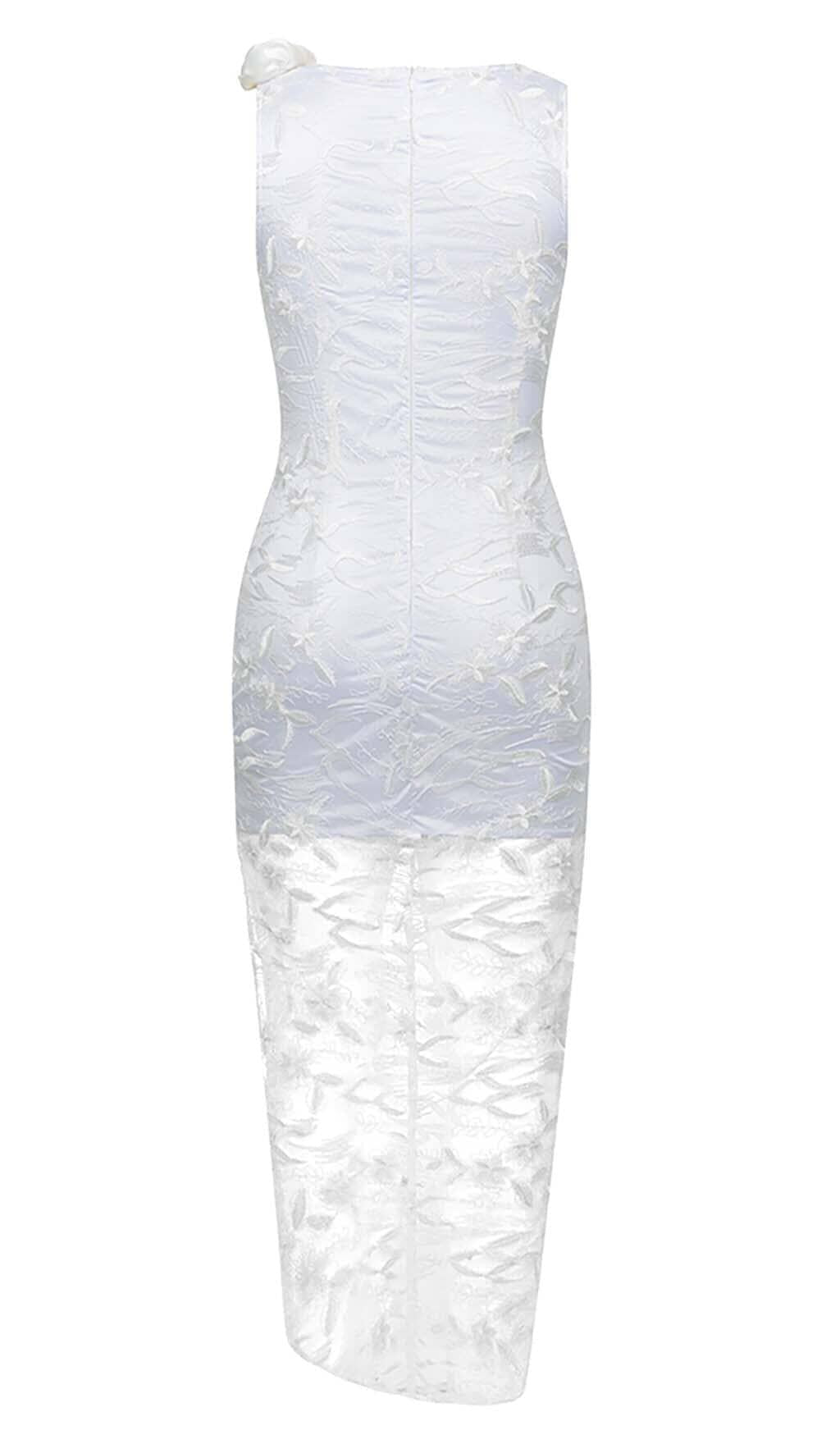 ROSE-EMBELLISHED LACE MIDI DRESS IN WHITE