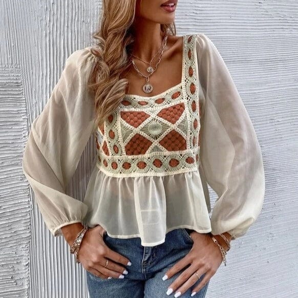 Express your free-spirited style with our Rosie Boho Blouse! Whether you're attending a shindig. sipping a fruity drink at the beach. or just living your best life. this blouse will do you justice. With its short length. square neckline. and crochet patchwork. you'll be sure to turn heads. And with balloon long sleeves and elasticized cuffs. you'll be comfortable and stylish all day long! So go on and show the world your inner hippie!