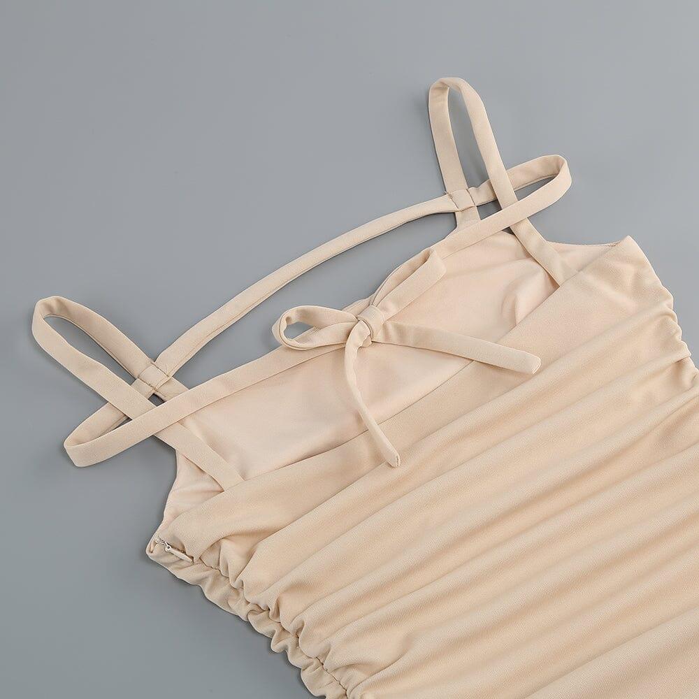 Elevate your style to new heights with our Ruched Strappy Midi Dress in Nude! This exquisite dress is tailored for the modern young woman who seeks to blend sophistication with a touch of sensuality. The delicate nude shade. paired with intricate ruching and strappy details. will have you radiating confidence and allure at any event.
