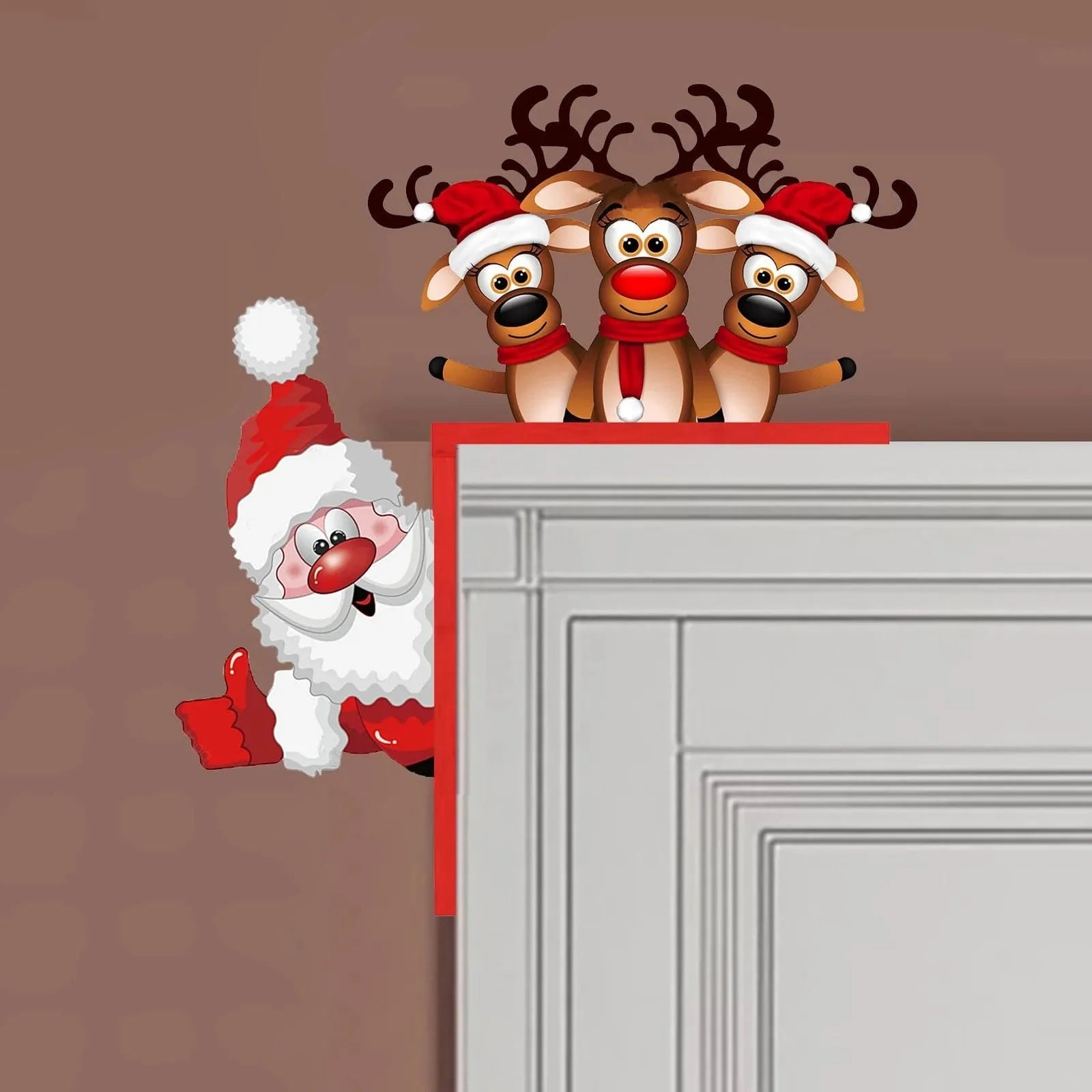 Bring a festive holiday touch to your home with this quirky Santa and Reindeer Wooden Corner Decoration. It's made of wood and features a whimsical Santa Claus and three reindeer - perfect for adorning door corners or any corner of your home! This ornament will have everyone laughing and in the Christmas spirit!