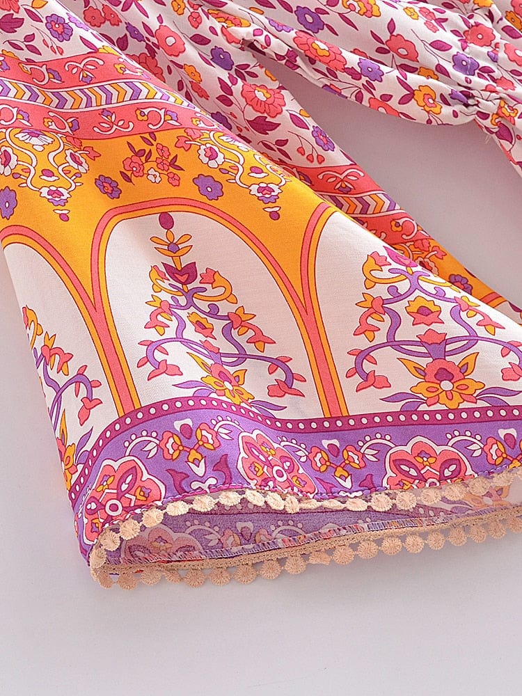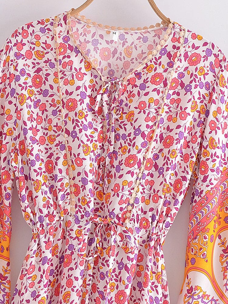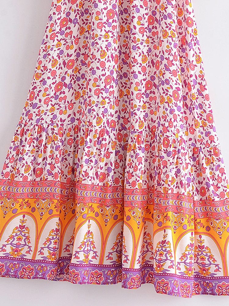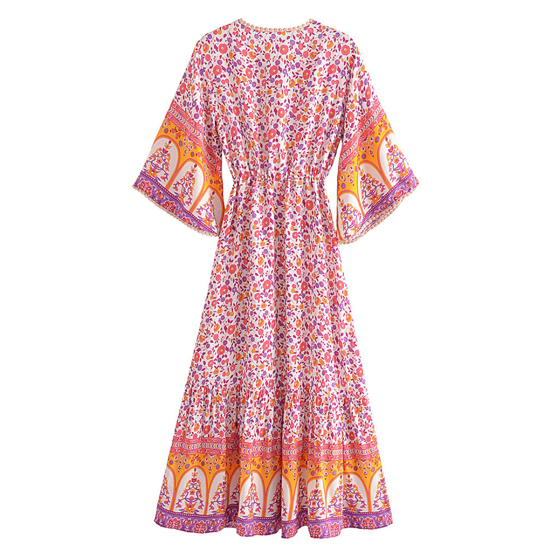 Looking for a bohemian-style dress that's both stylish and comfortable? Then check out the Sarai Bohemian Maxi Dress. This beautiful pink floral print dress features batwing sleeves. a round neck with hanging tie. and a flowing skirt that's perfect for twirling. Plus. the lightweight fabric will keep you cool and comfortable all day long.