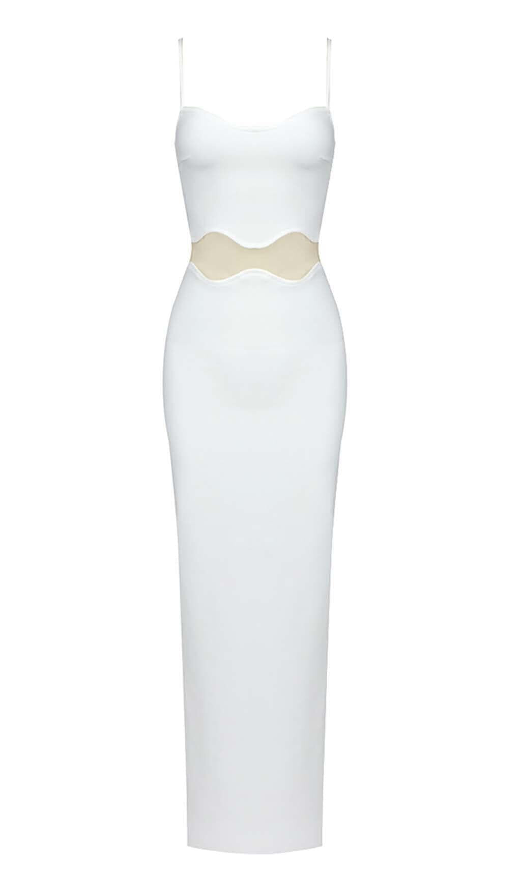 Brighten up your evenings in the Scalloped Mesh Insert Maxi Dress in White. Designed exclusively for CB. this dress is the epitome of elegance and style. With its stunning illusion mesh. off-the-shoulder short sleeves. and v-neck bodice trimmed with delicate eyelash lace. this dress is sure to turn heads wherever you go.