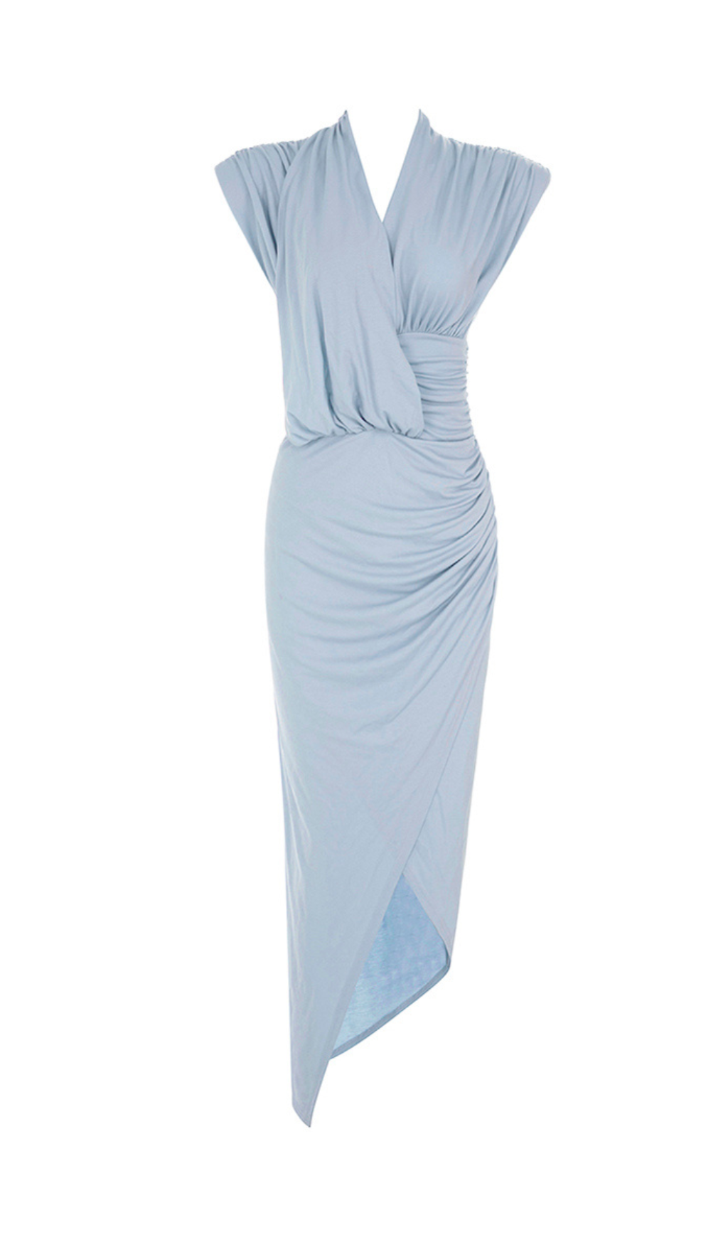 The bold shoulder pads and ruffled V-neck create a daring look. while the asymmetric hem adds a touch of adventure. Stand out and challenge the norm in this unique and stylish dress.