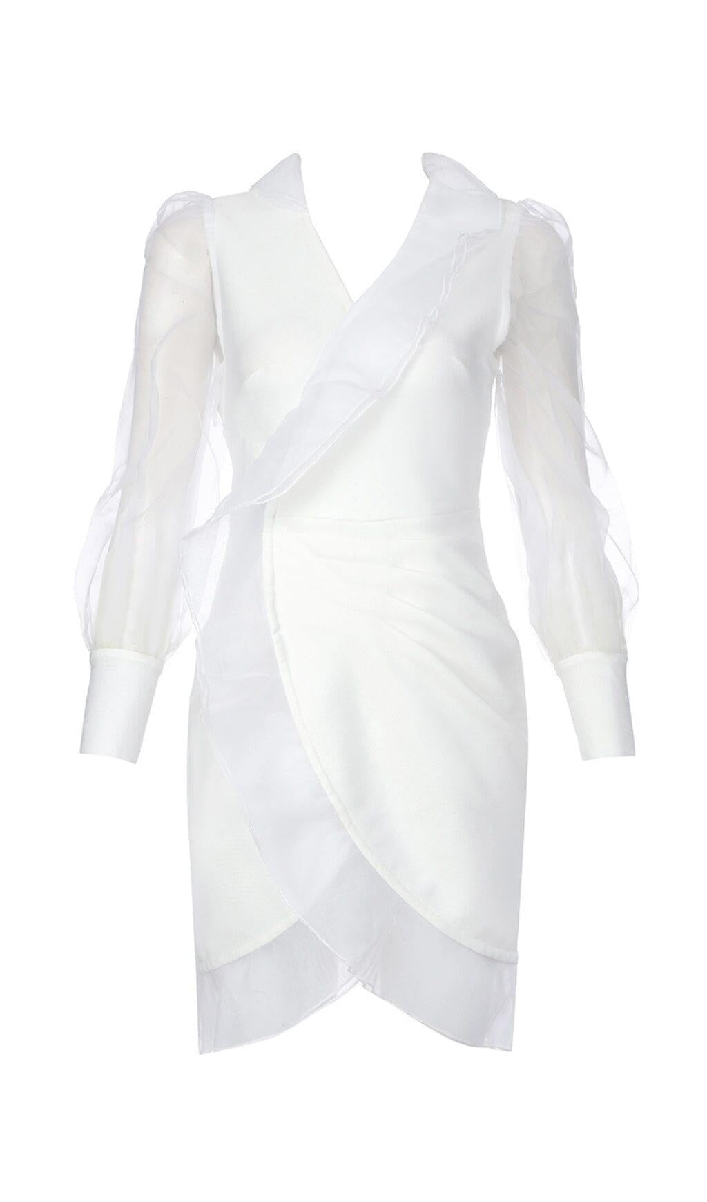 The Solid Mesh Long Sleeve Ruffle Mini Dress is a versatile and stylish choice that will have you looking and feeling your best. Crafted from a combination of stretchy mesh and solid fabric. this dress features a flattering V-neckline. long sleeves. and a ruffle hemline that falls asymmetrically to add movement and interest. With its unique design and attention to detail. this dress is perfect for any occasion.
