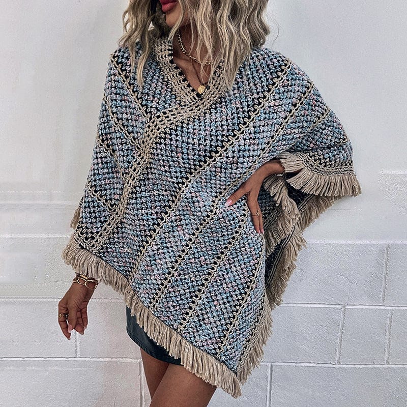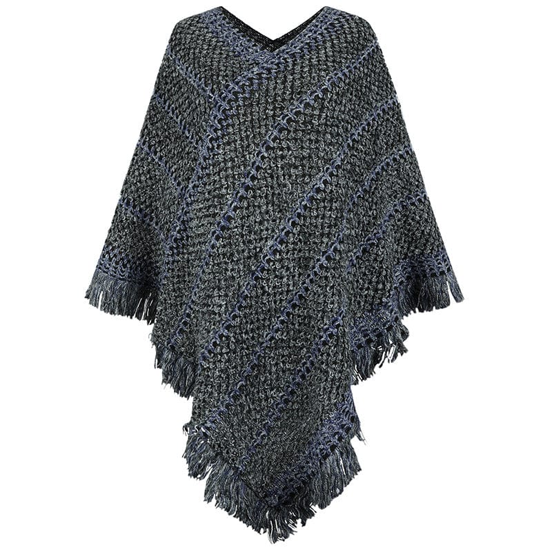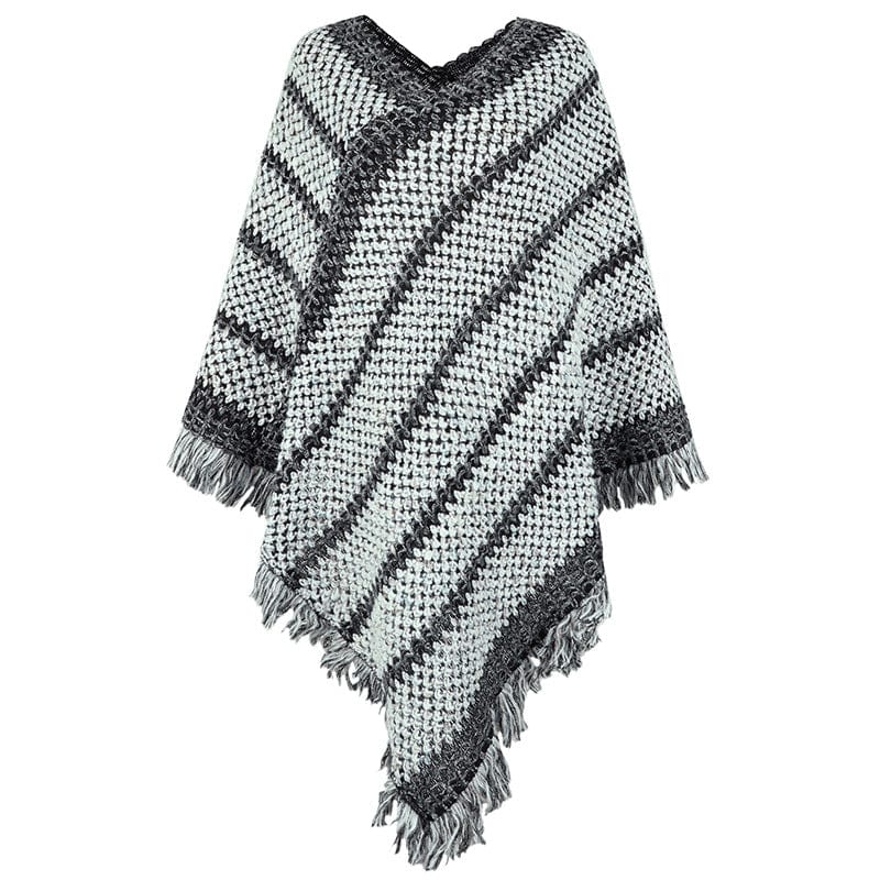 The Solstice Knitted Poncho is the perfect way to stay warm this winter. Made from warm. thick fabric. this poncho features a V neck. long sleeves. and a fringed hem. The neutral color will go with any outfit. and the poncho can be worn dressy or casual.