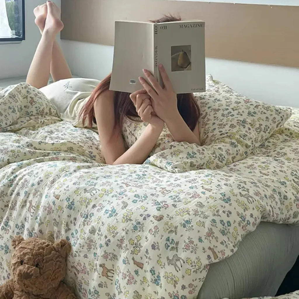 Step into a springtime fairytale with our Woodland Bloom Muslin Duvet Cover Set! Adorned with the most charming little deer and bunnies nestled among soft florals. this set turns your bedroom into a peaceful forest hideaway. It's made from airy. breathable cotton muslin—perfect for keeping things light and cozy as the weather warms up.