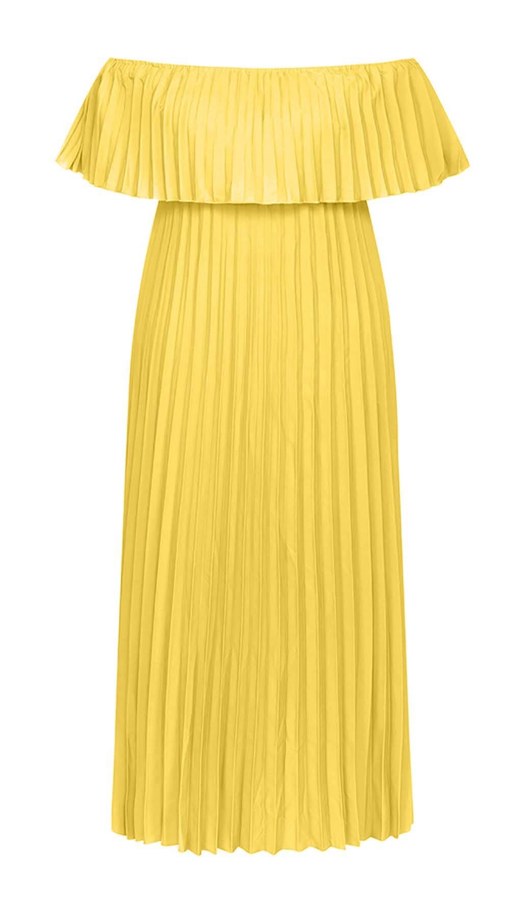 Introducing our Strapless Pleated Maxi Dress in a stunning sunny yellow shade. This dress is guaranteed to brighten any room and turn heads wherever you go. Whether you're attending a tropical vacation. a summer garden party. or an outdoor wedding. this dress is the perfect choice for a chic and stylish look.