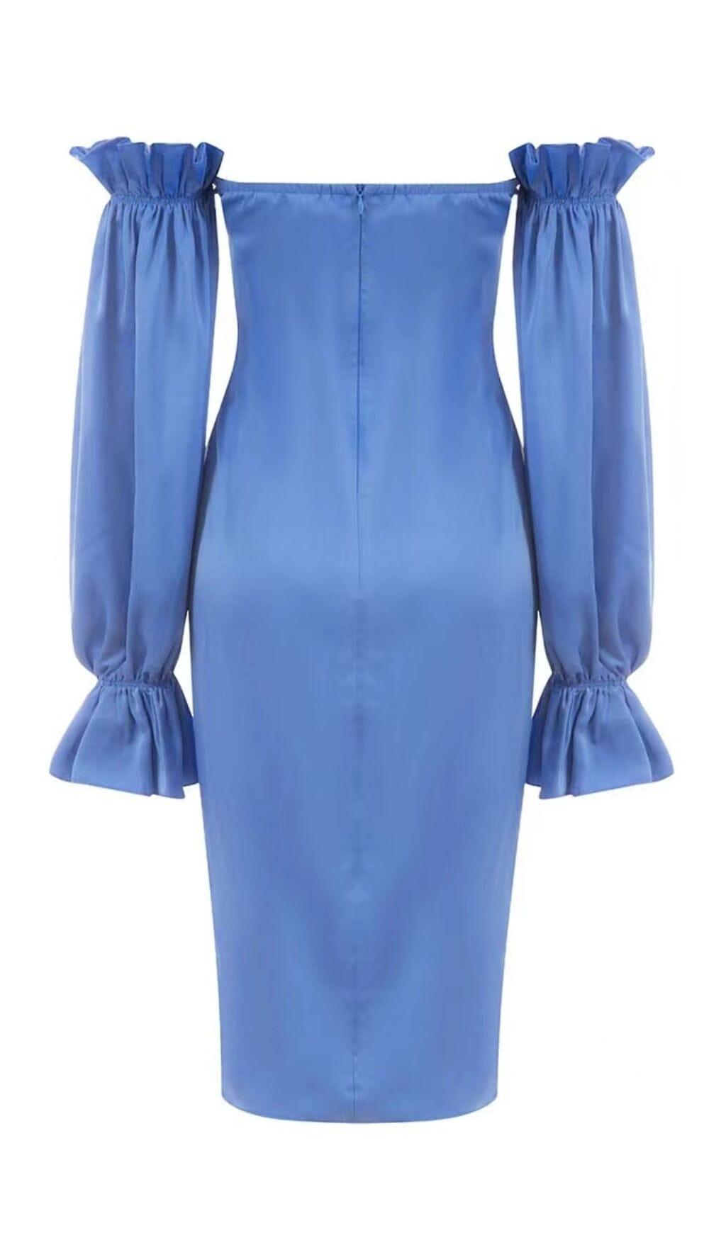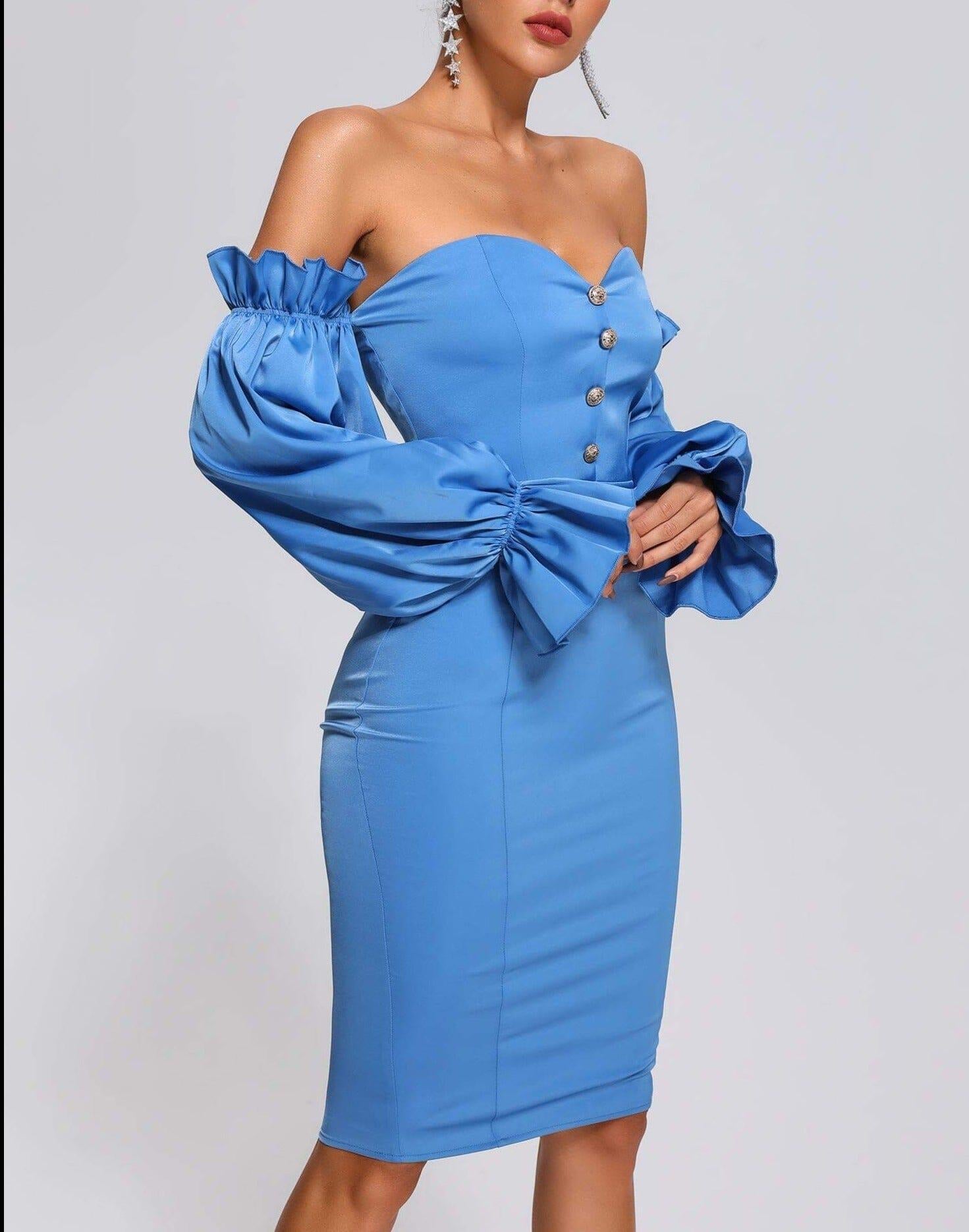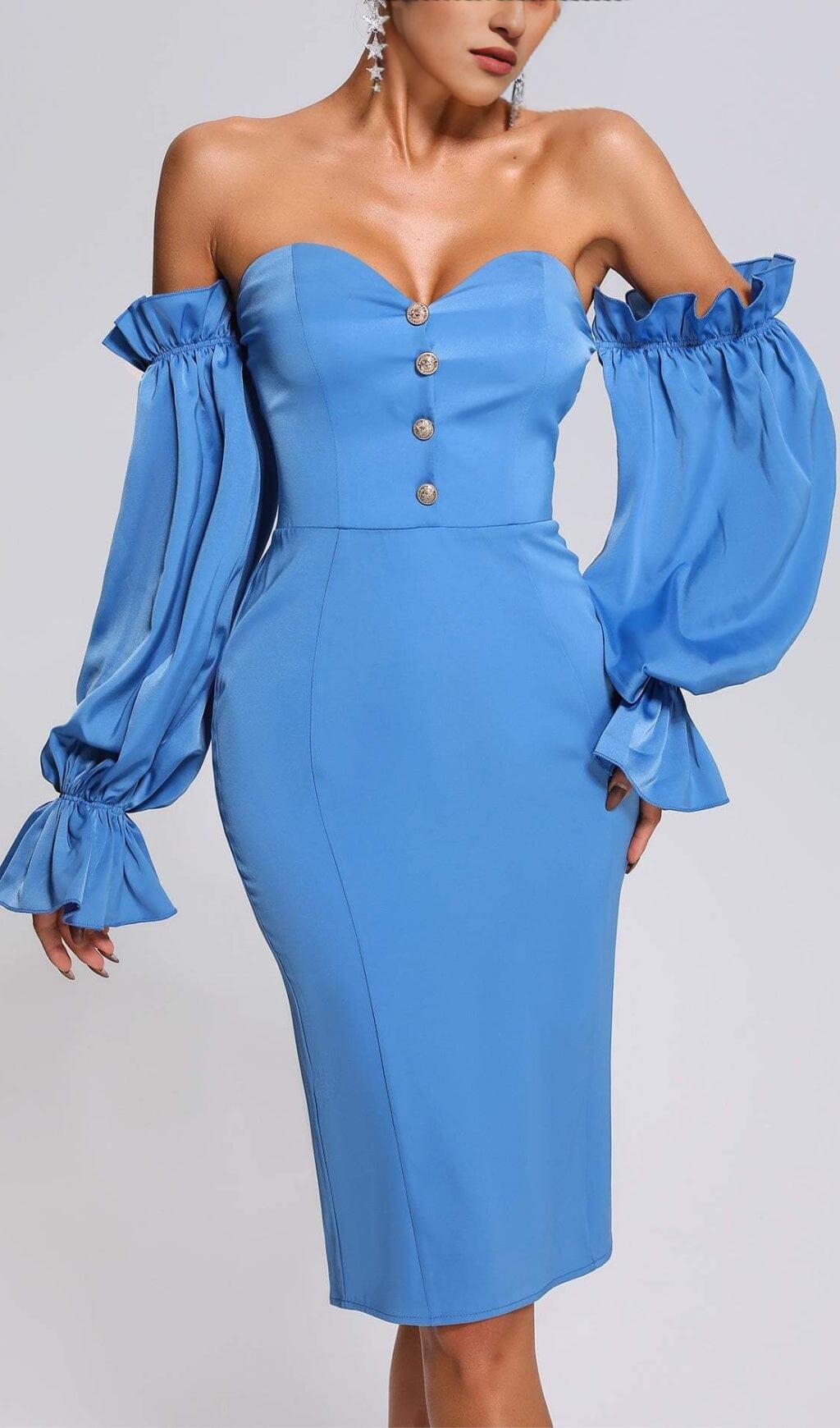 Introducing our stunning Blue Off Shoulder Satin Midi Dress. a perfect addition to your wardrobe. This dress is designed to make you look and feel confident. stylish. and elegant.