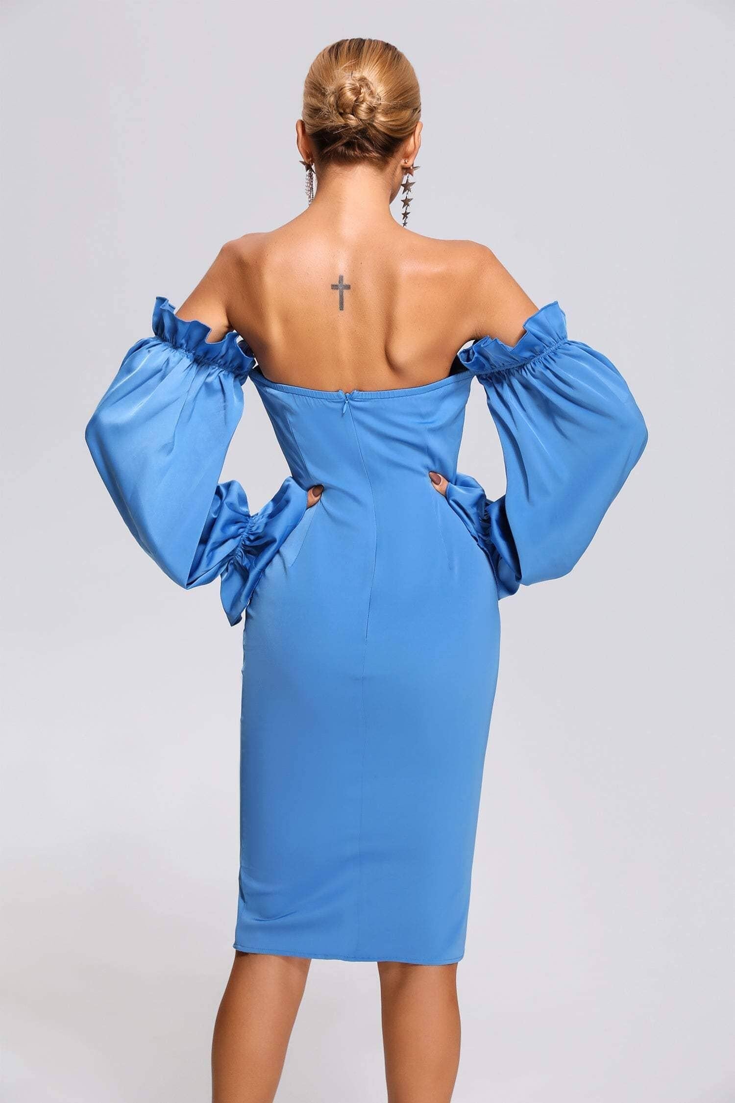 Don't compromise on style and comfort. Choose our Blue Off Shoulder Satin Midi Dress and be the best-dressed guest at any occasion. Order now and experience the confidence and elegance that comes with wearing this stunning dress.