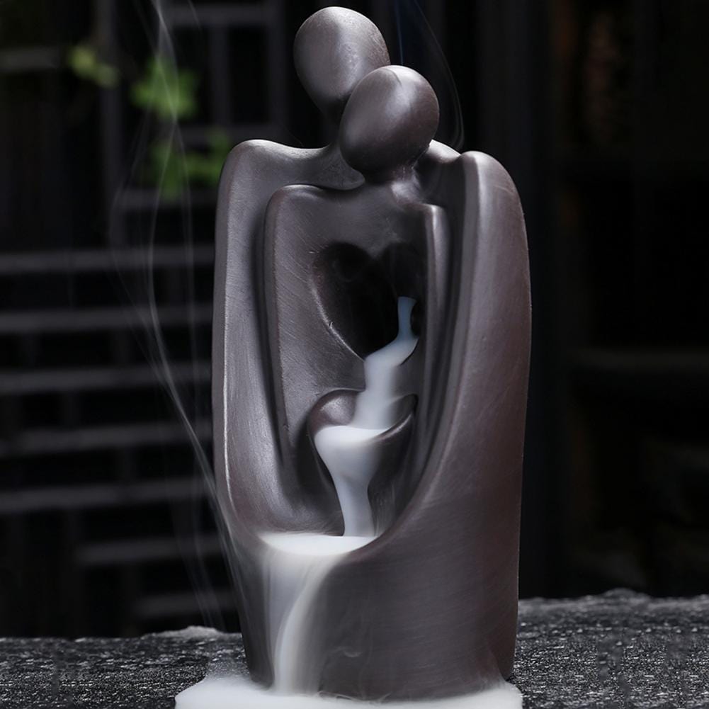 The Lovers backflow incense burner is sculpted in the form of two lovers hugging. This unique burner features a backflow design that allows the smoke to flow downwards. creating a waterfall-like effect. The best part is that it doesn't require any special setup - simply light the incense cone and enjoy the soothing scent. With its elegant black finish and abstract design. the Lovers Backflow Incense Burner is sure to become a favorite addition to any home.
