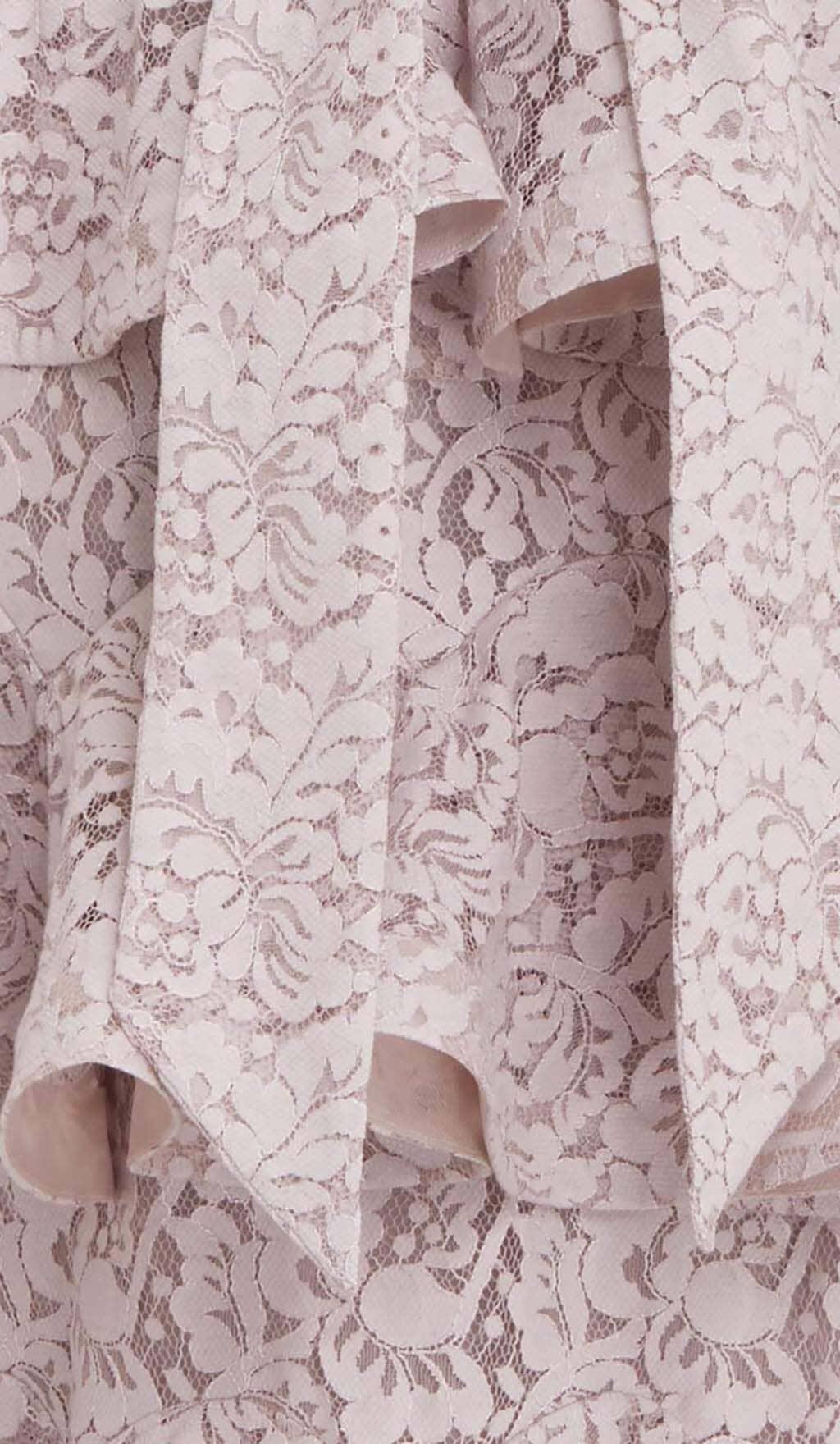 The tiers of floral lace on this dress give it a romantic and feminine feel. You'll feel elegant and beautiful as you twirl around in this stunning dress.