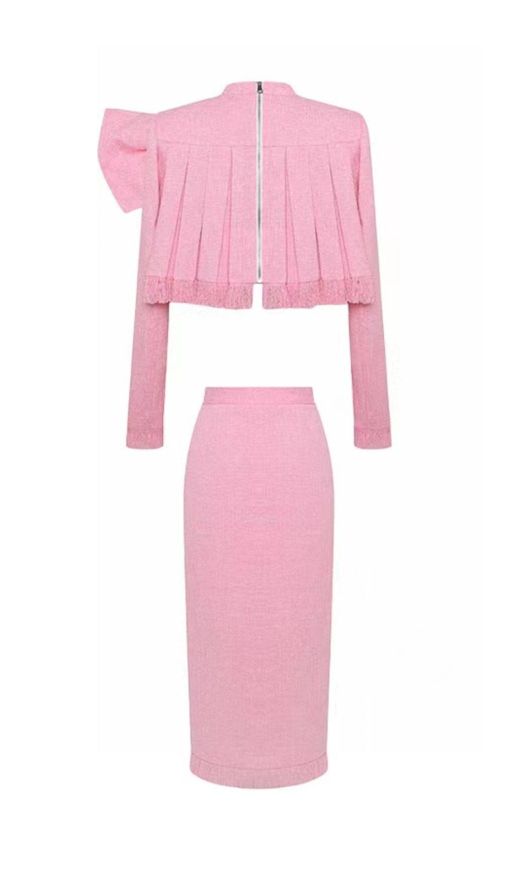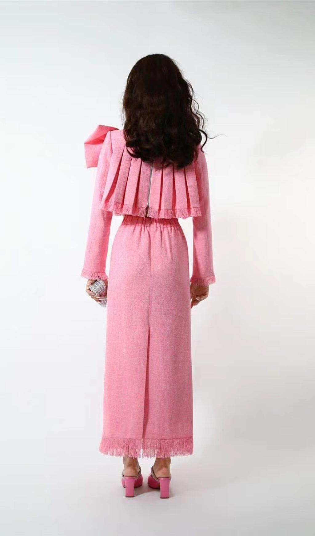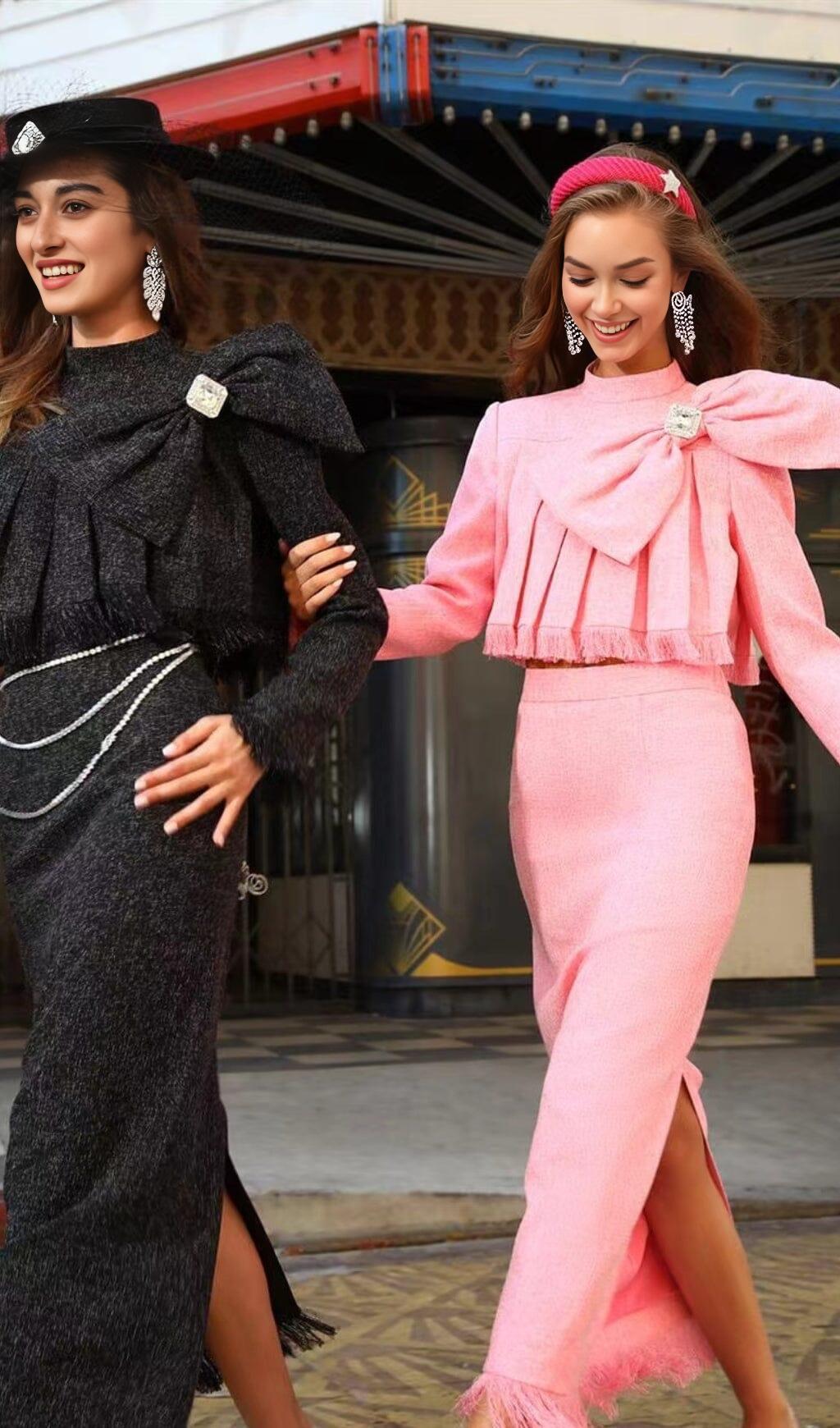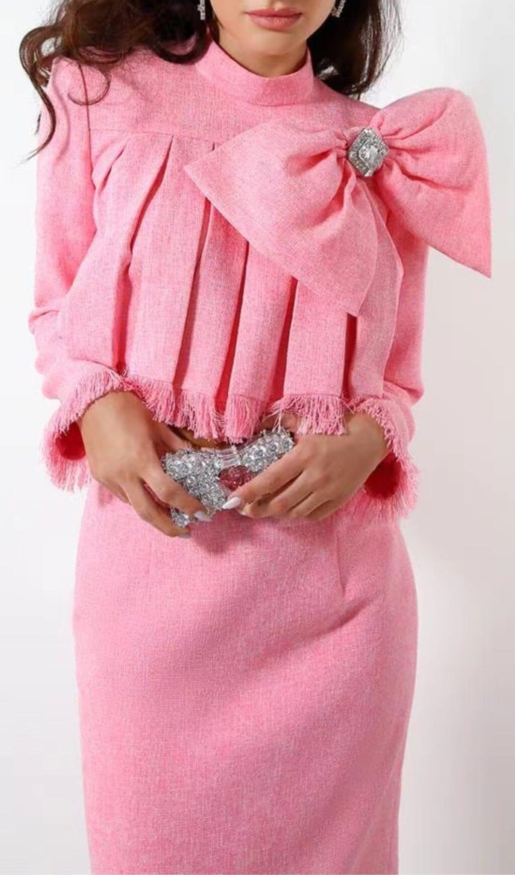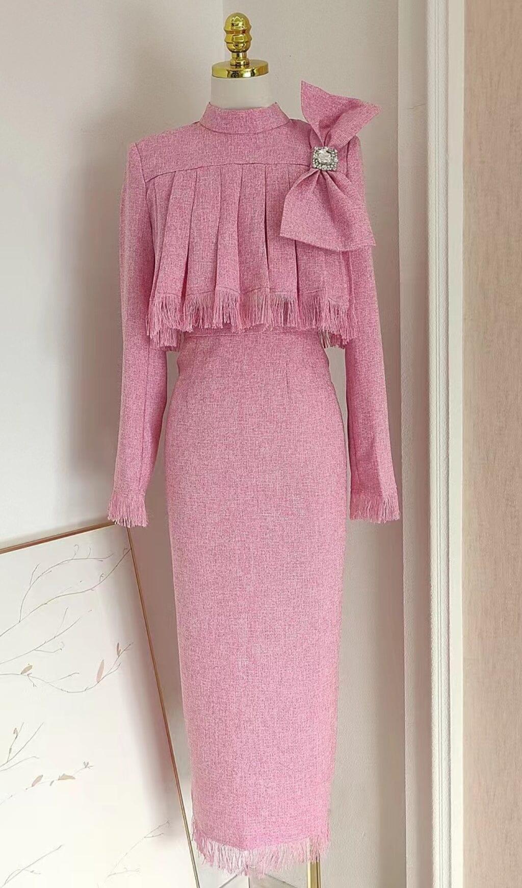 Experience timeless luxury with the pink tweed bow embellished set. Crafted from exquisite. soft fabric. this elegant set is designed with a high neckline top and oversized bow detail for added sophistication. The coordinating pencil skirt features a fringed hem for a modern finish. Perfect for any special occasion. this exquisite set is sure to make a statement.