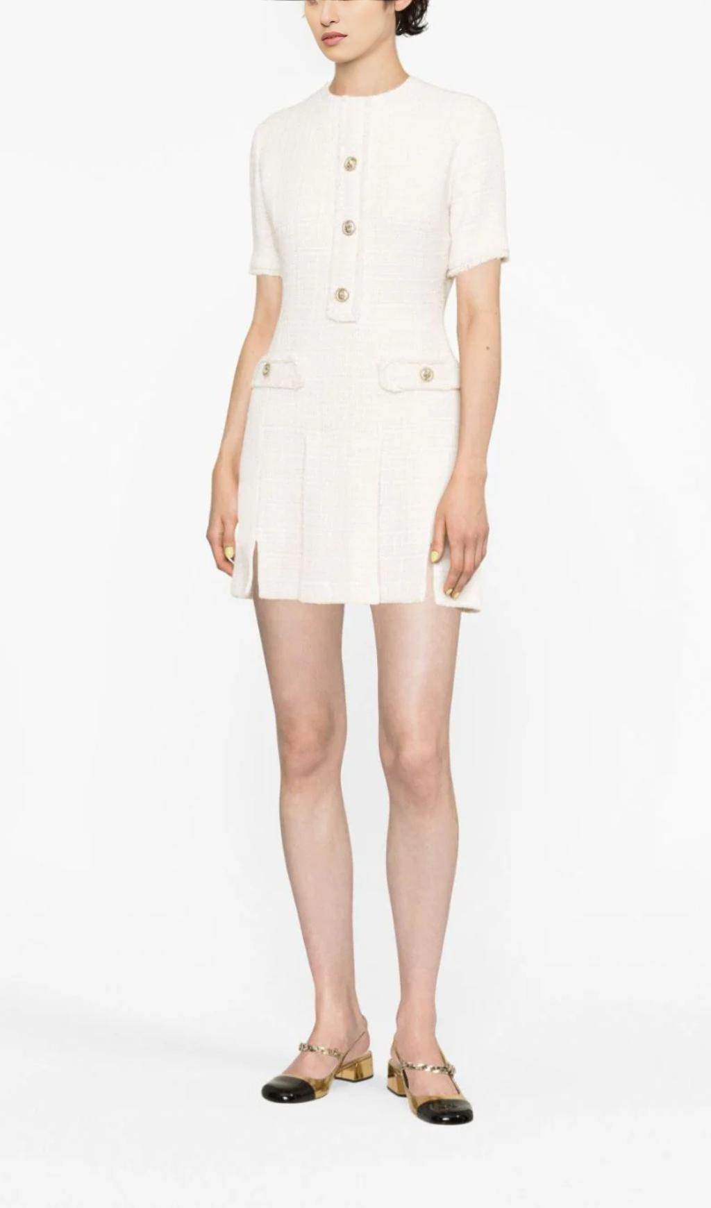 Made from high-quality tweed fabric. this dress offers timeless elegance and versatility. Perfect for any occasion. the TWEED MINI DRESS will make you stand out and feel confident. Elevate your style game now!"