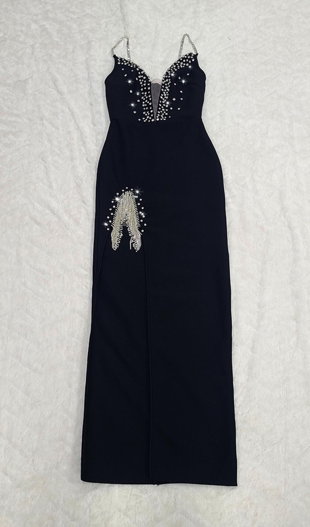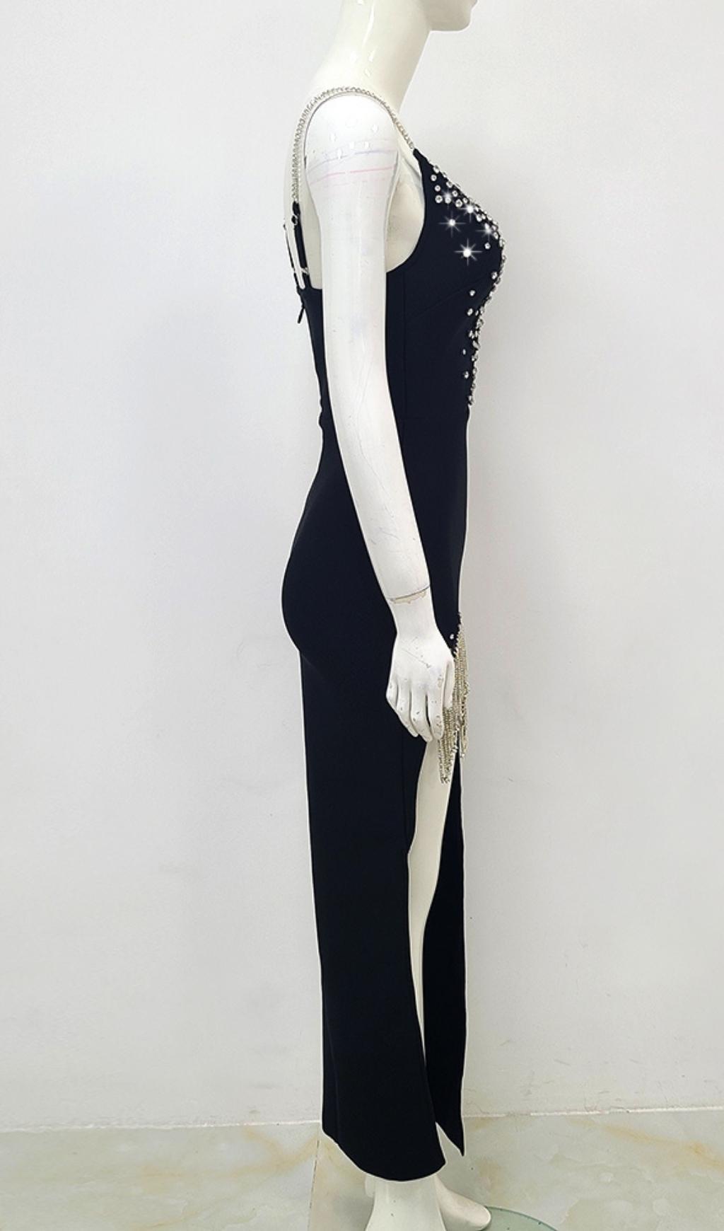 This V Neck Maxi Dress in Black is the perfect combination of elegance and style. Designed for parties and with a romantic holiday vibe. this dress is a must-have for any occasion. The deep V neckline adds a surprising touch. while the trim on the bodice and the pendant on the split part create a beautiful and cohesive look.
