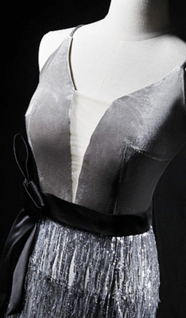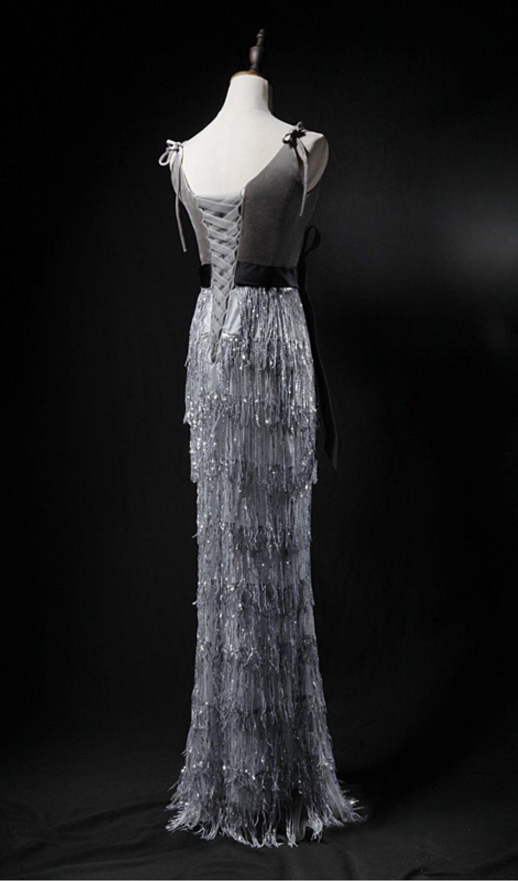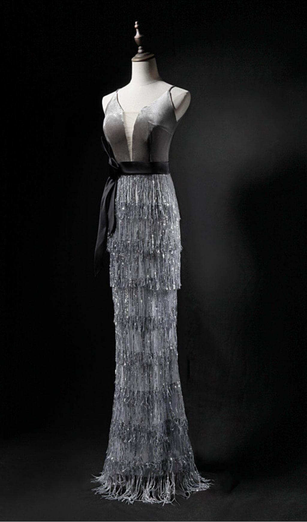 Step into a world of romance and elegance with our Velvet Tassel Tie-Down Maxi Dress in Grey. This dress is designed with spliced fringe. combining romantic elements with an elegant and generous touch. Its ruffled V-neck design beautifully highlights the collarbone. exuding a sense of grace and femininity. The addition of a black bow at the waist creates a sweet and elegant girlish look. accentuating your waist curve and adding a slimming effect.