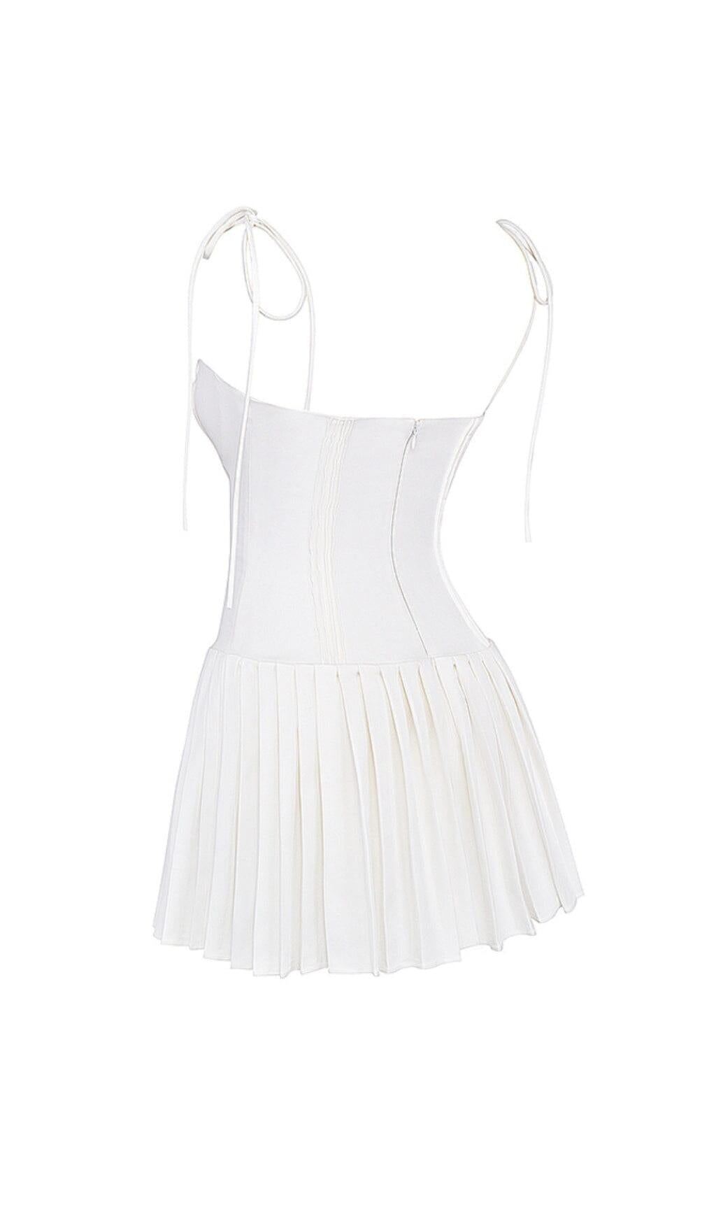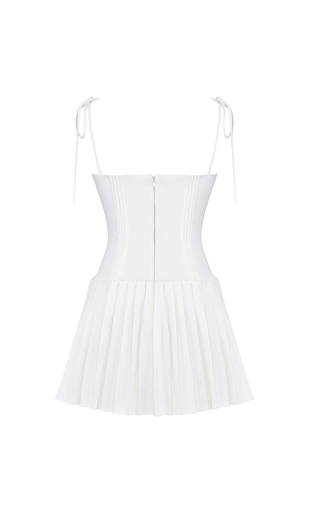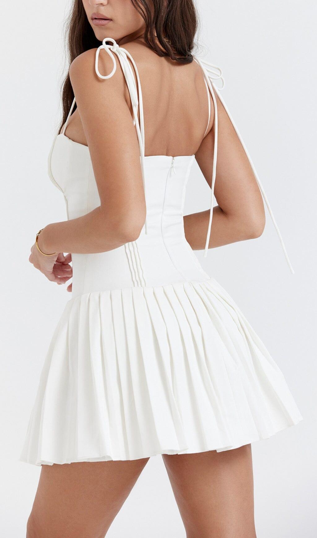 This white pleated mini dress is ultra feminine and the perfect dress for the Summer season. It has the prettiest details like the pin tuck bodice and hook and eye detailing to the front. The voluminous pleated skirt adds a touch of elegance and highlights great legs.