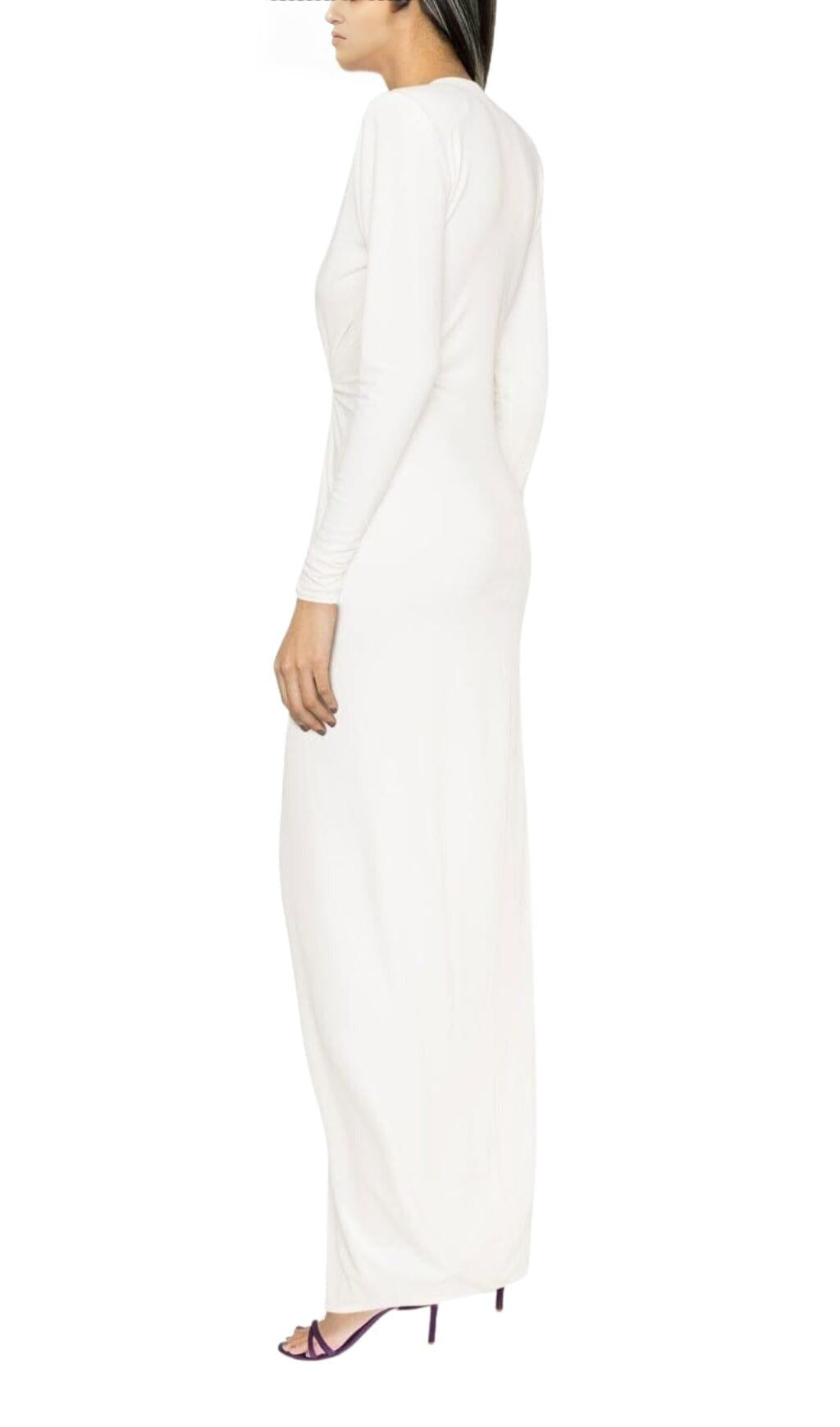 Dare to take risks with this bold white plunging-neck draped gown. Perfect for an adventurous night out. this striking gown will make heads turn and show off your daring side. Embrace the challenge with fashion-forward style!