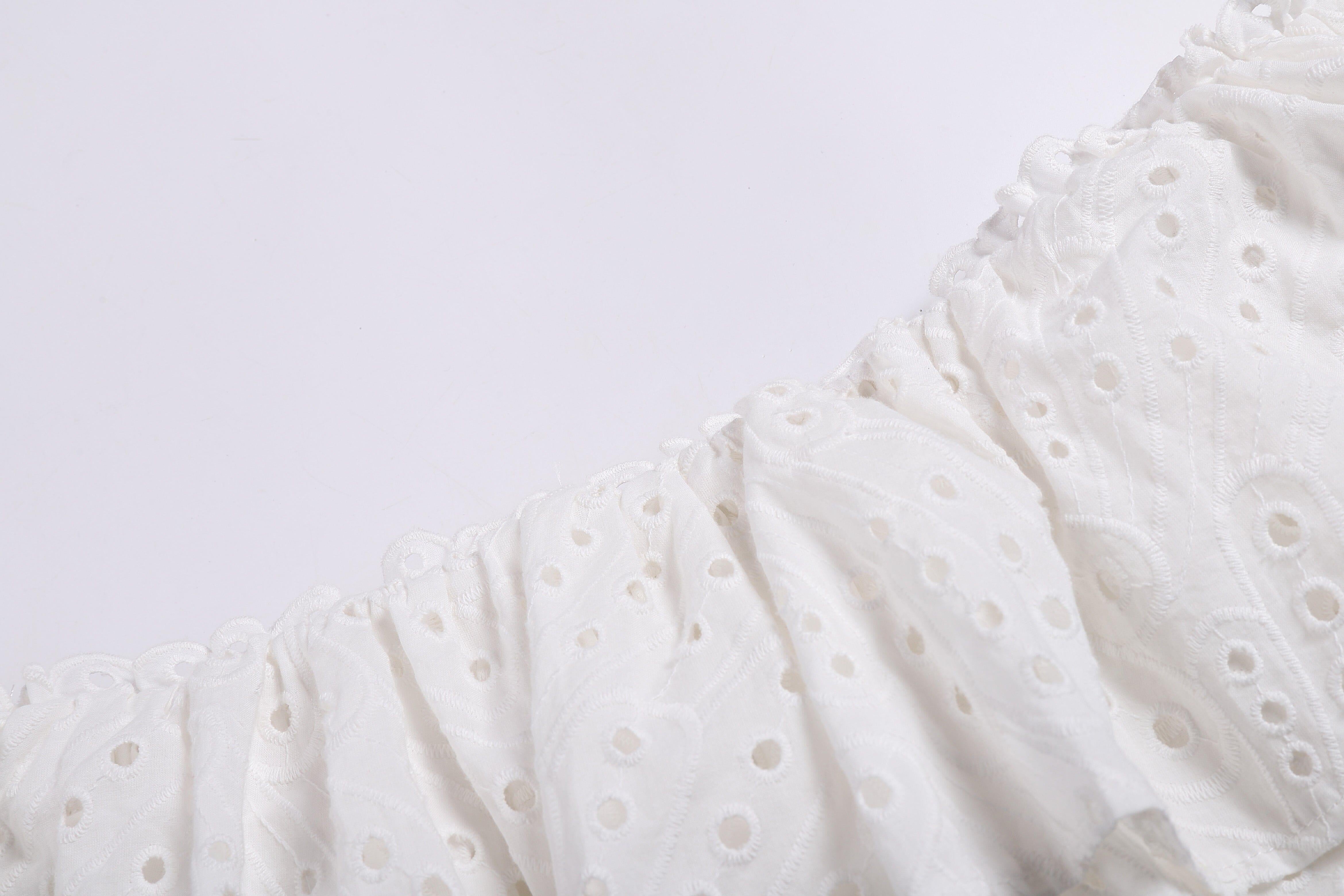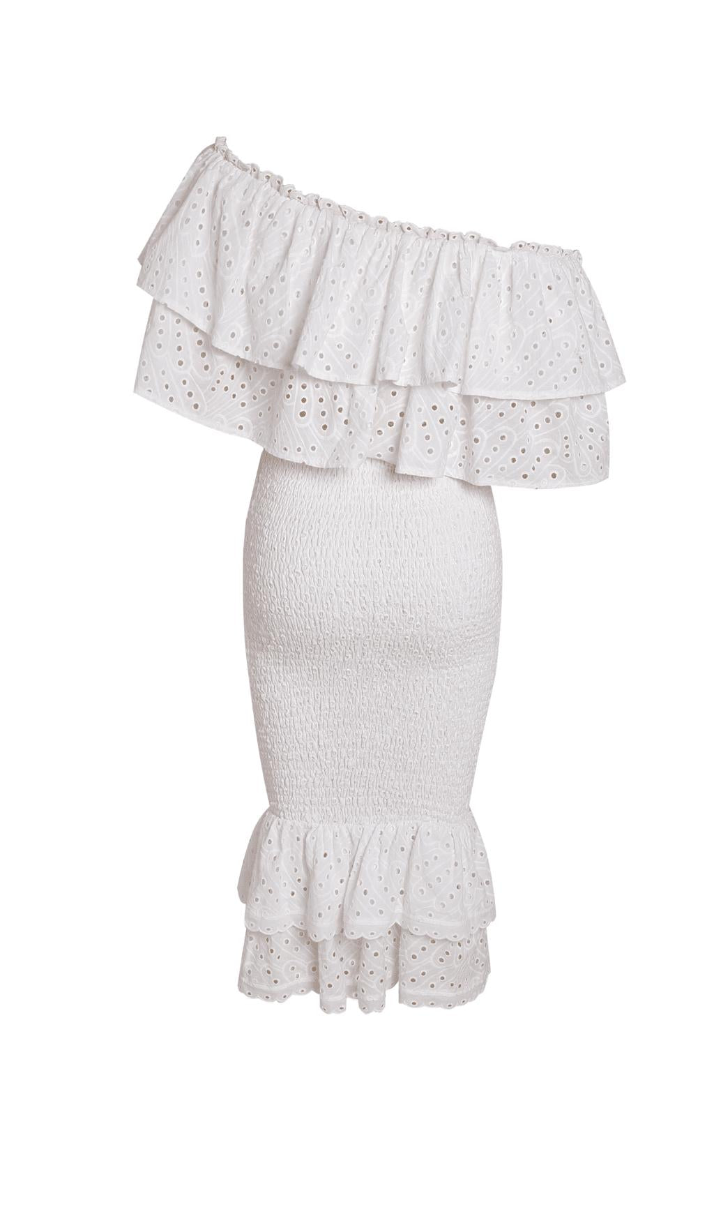 Make a statement with this eye-catching two-piece set! Featuring a strapless. ruffled top with a skewed collar and a high-waisted midi dress. you'll be the life of the party. Look gorgeous and dance all night long in this unique look!
