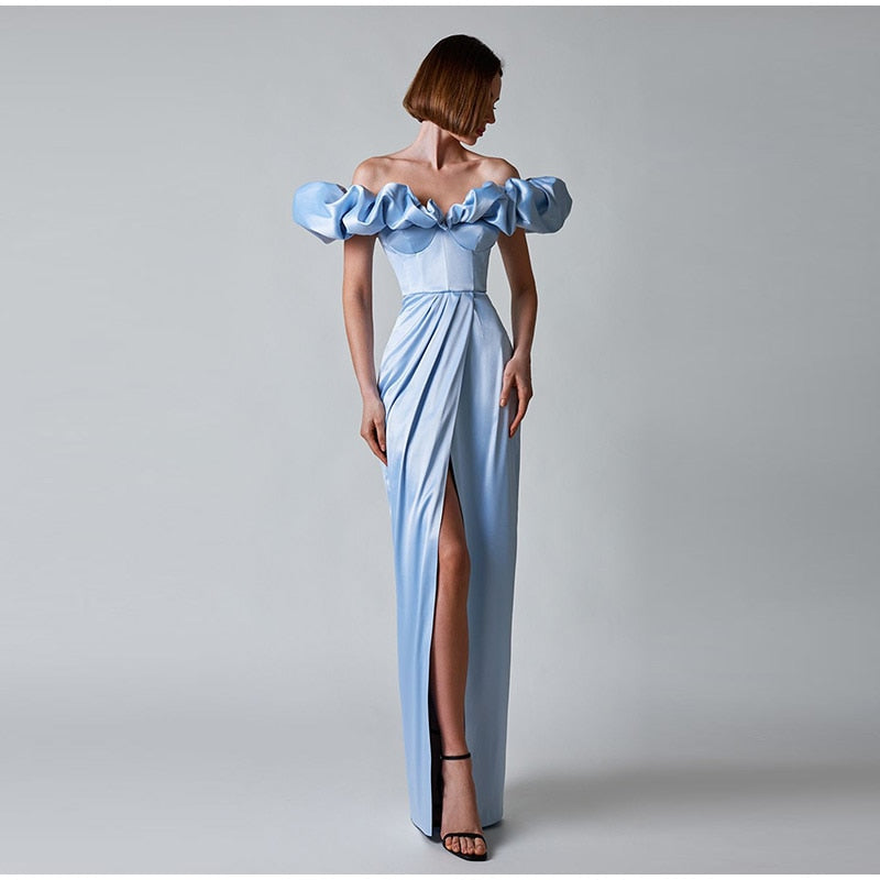 Redcit - One-Shoulder Puff Sleeve Wrap Chest Slit Long Dress