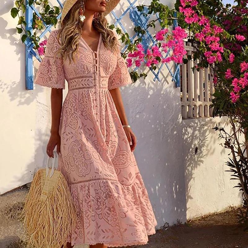 Redcit - Women Sweet V Neck Hollow Out Single-Breasted Lace Long Dress