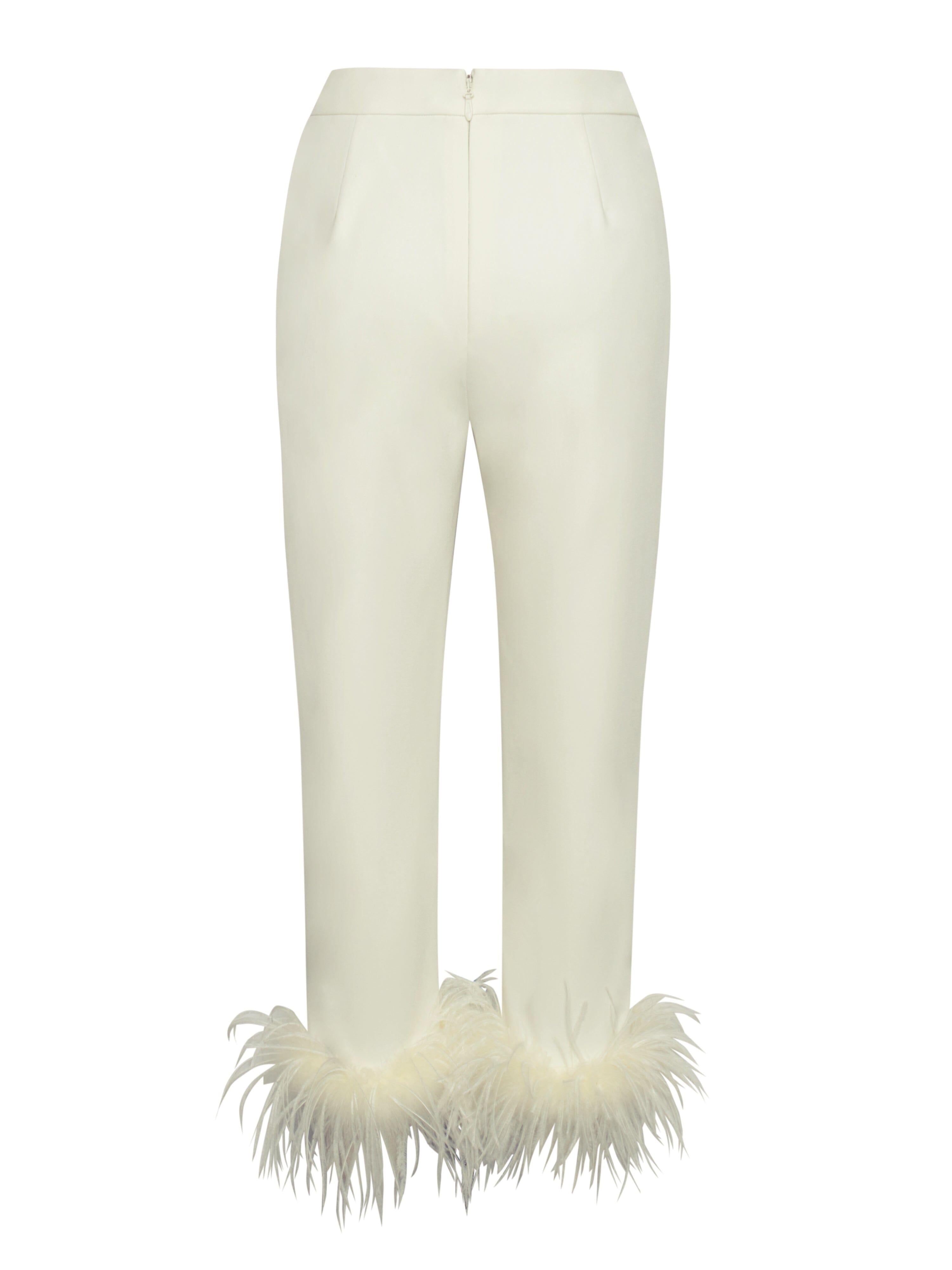 Don't settle for ordinary. Stand out from the crowd with our Cream White Blazer Suit with Feather Trim. Add a touch of luxury and sophistication to your wardrobe today!