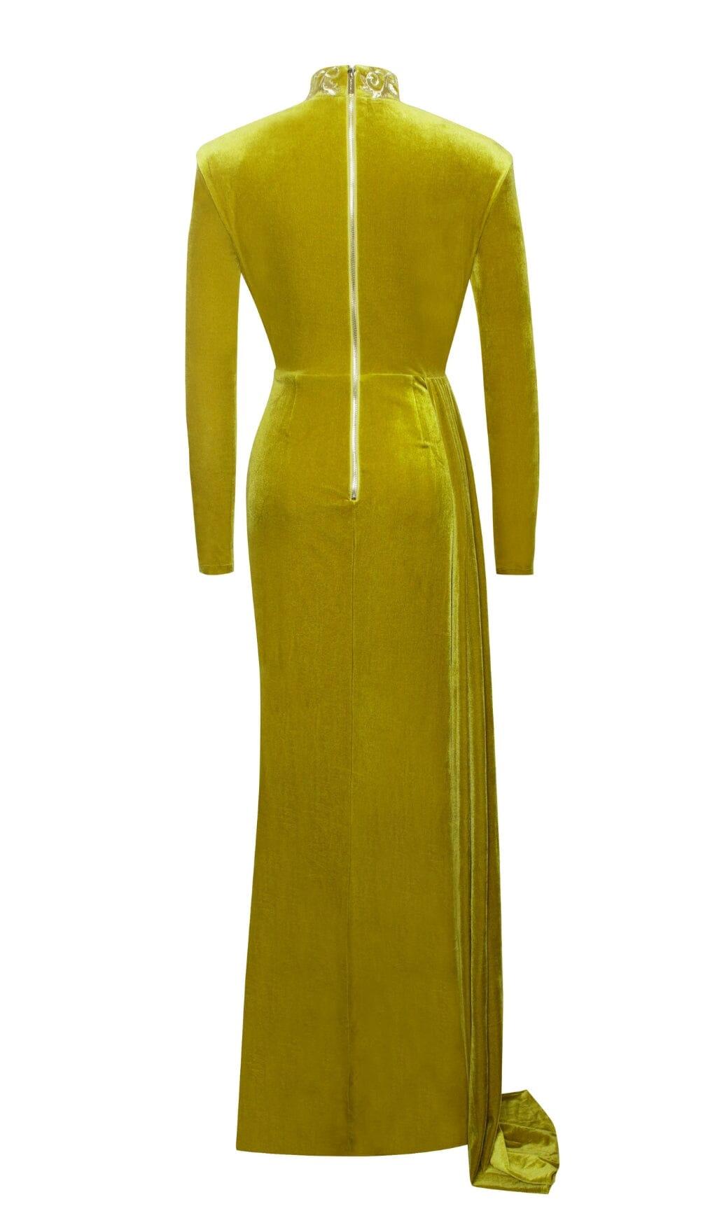 Choose the Zenaida Gold Cutout High Slit Velvet Gown and make a statement wherever you go. With its impeccable design and luxurious feel. this gown is a must-have for any fashion-forward individual.
